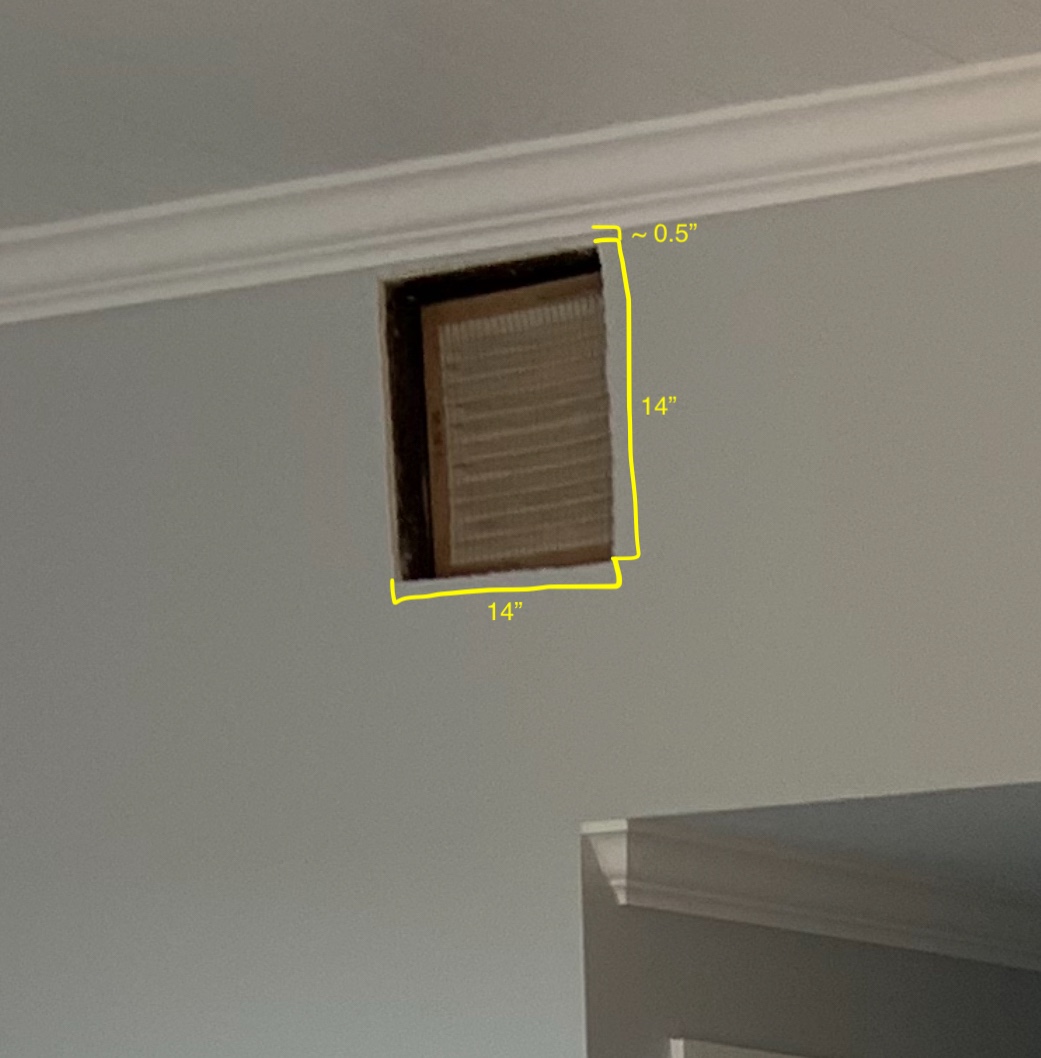 I have a return vent opening that is 14". However, I have wood trim that is 1" above my vent opening, so the return vent grille needs to be at most 14.75" overall. I need to be able to open and open and close the grille for whenever I change the air filter. There are no metal grilles that exist with for a 14" opening, with 14.75" (or less) overall dimensions. See example below of a metal one that is the correct opening size, but the frame makes the overall dimension too big. https://hvacpremium.com/products/14in-x-14-steel-return-air-filter-grille-for-1in-filter-removable-face-door-hvac-duct-cover-flat-stamped-face-white-outer-dimensions-165w-x-165h?variant=15783607763010
